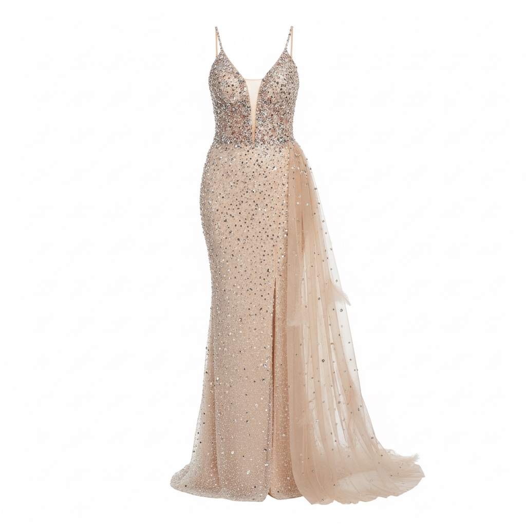 sup921 - Haute Couture Beige with Colored Studs Dress and Side Overskirt