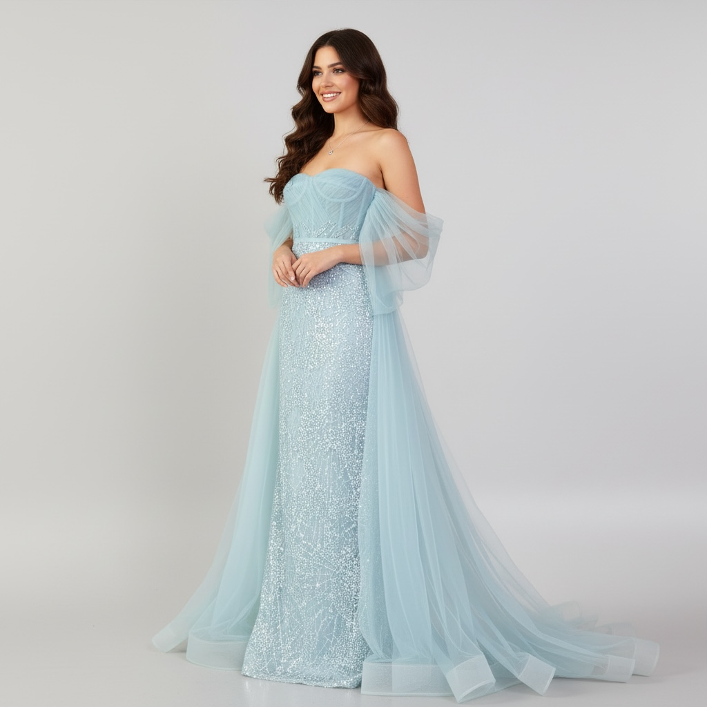 Pdv132 - Blue Off Shoulder Straight Cut With Overskirt