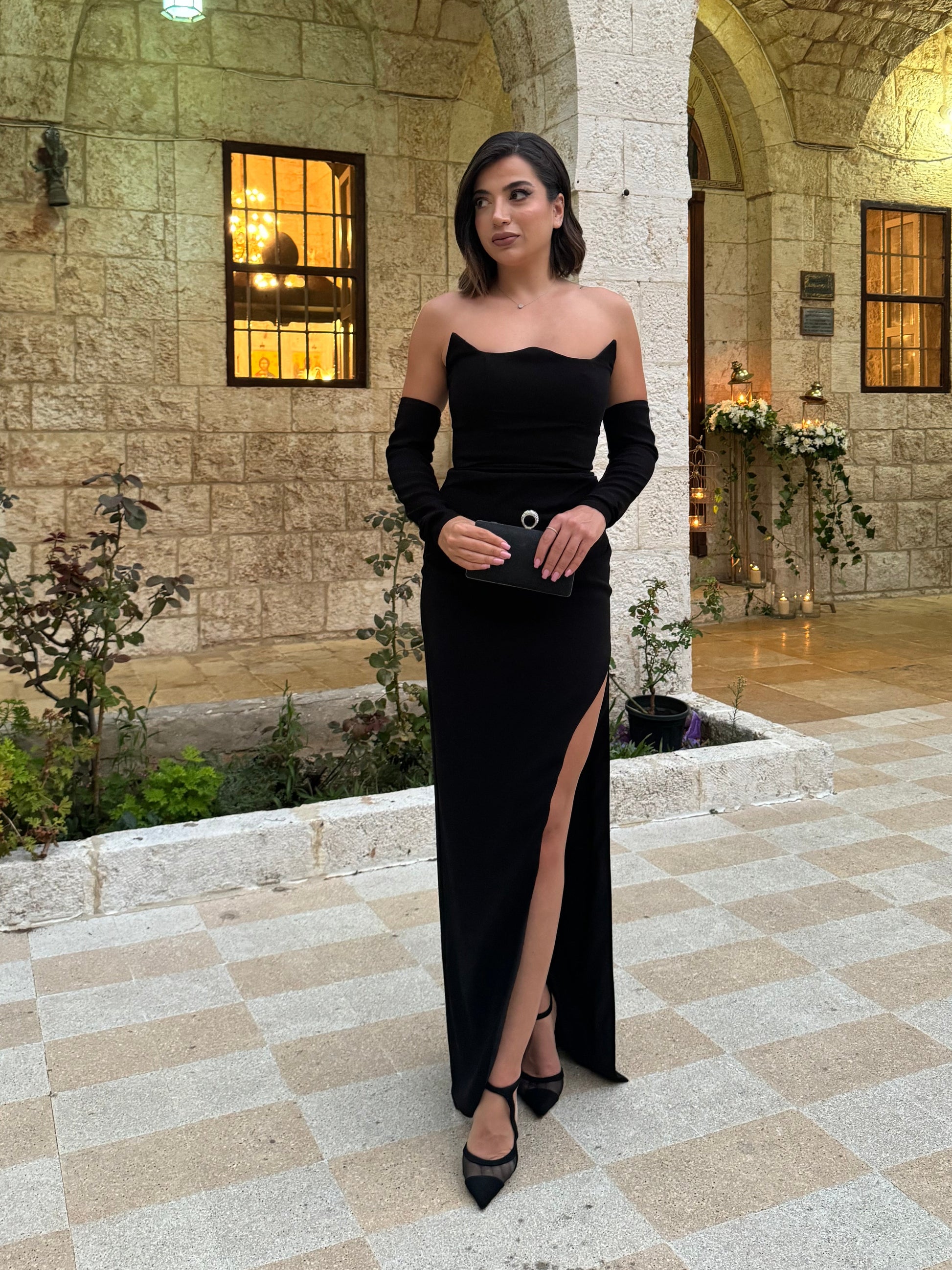 pdv100- Black Corset Crepe Dress With Sleeves