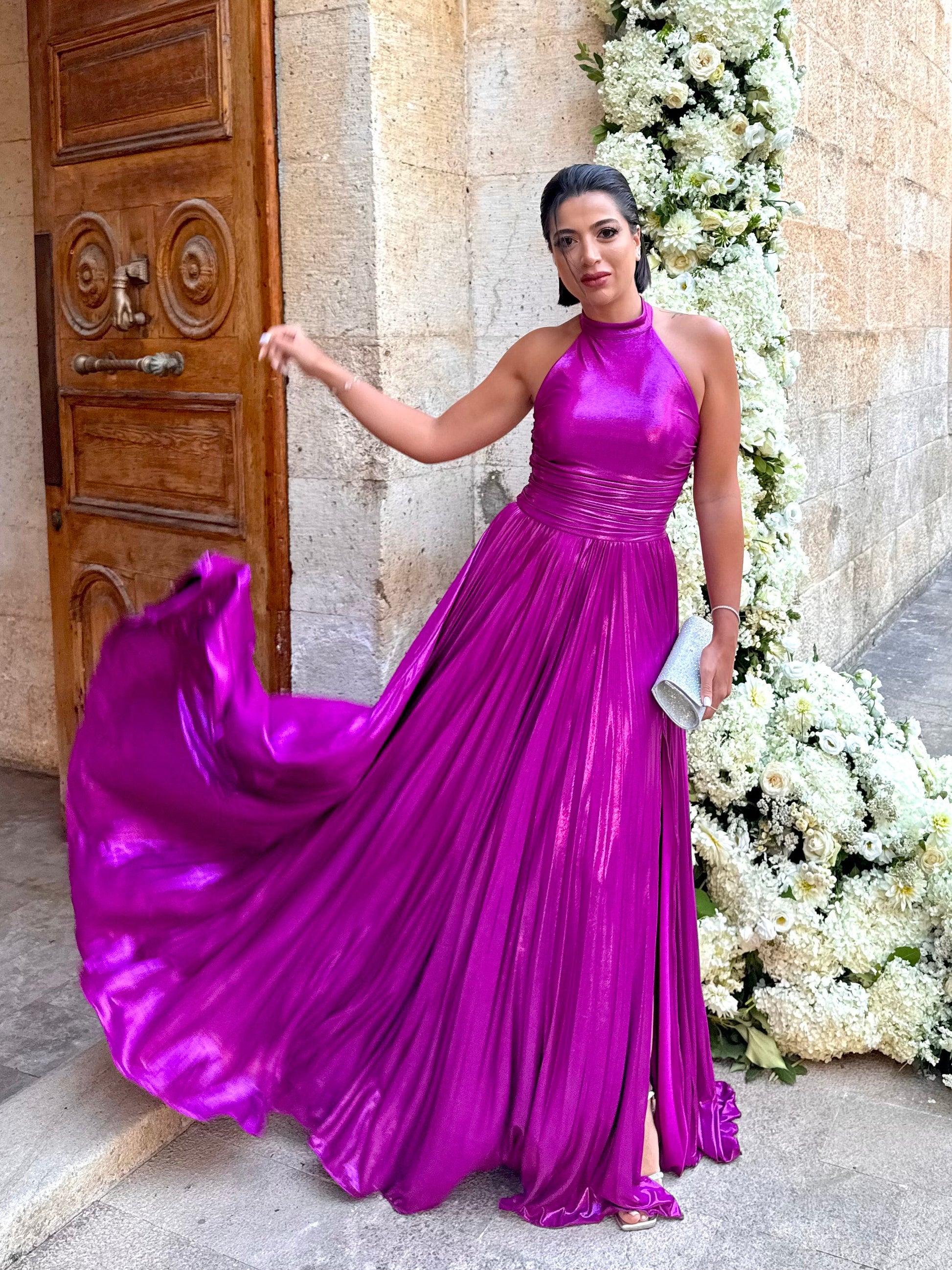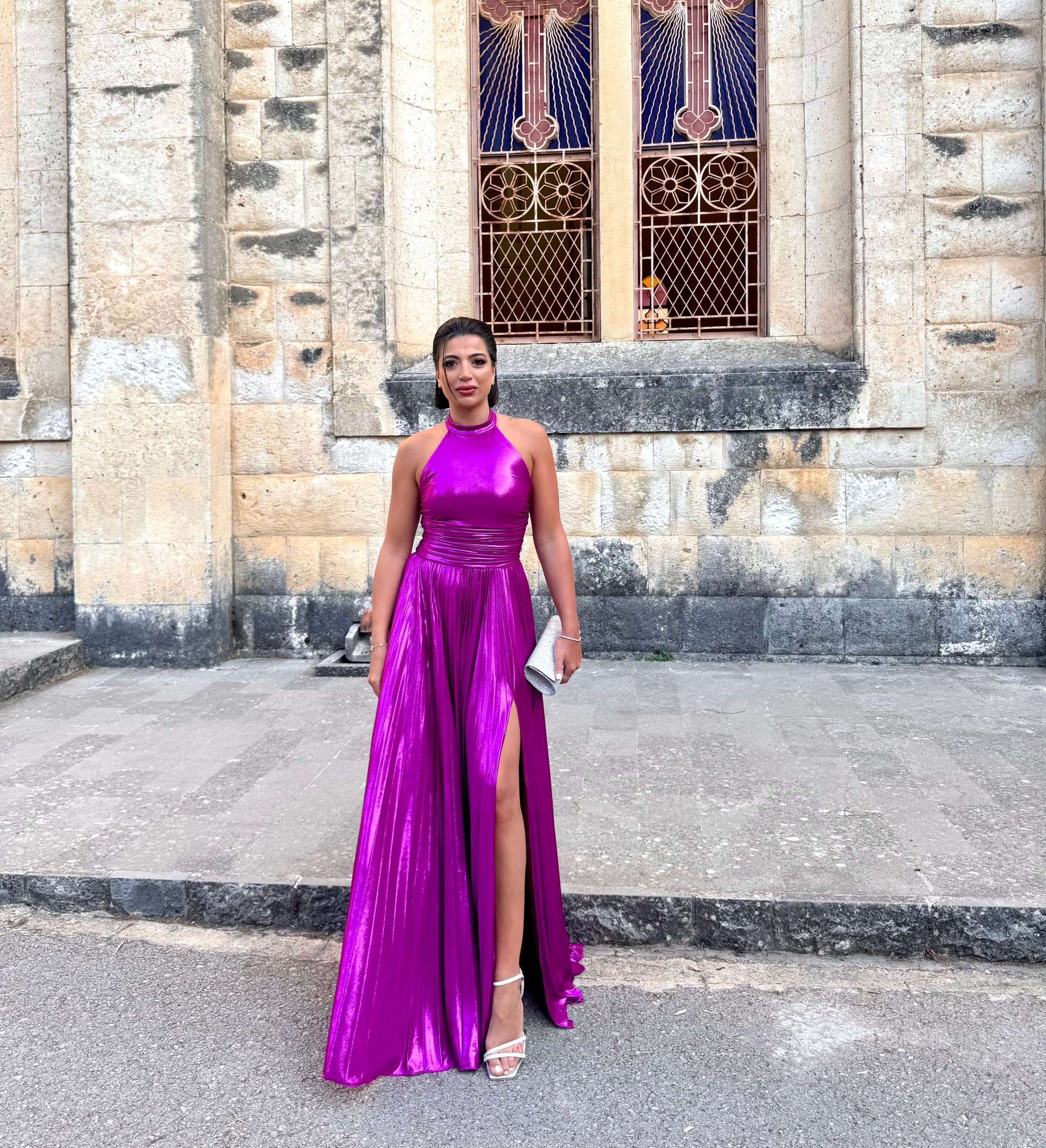 Pdv141- Pleated Metallic Fuchsia Dress Halter Neck